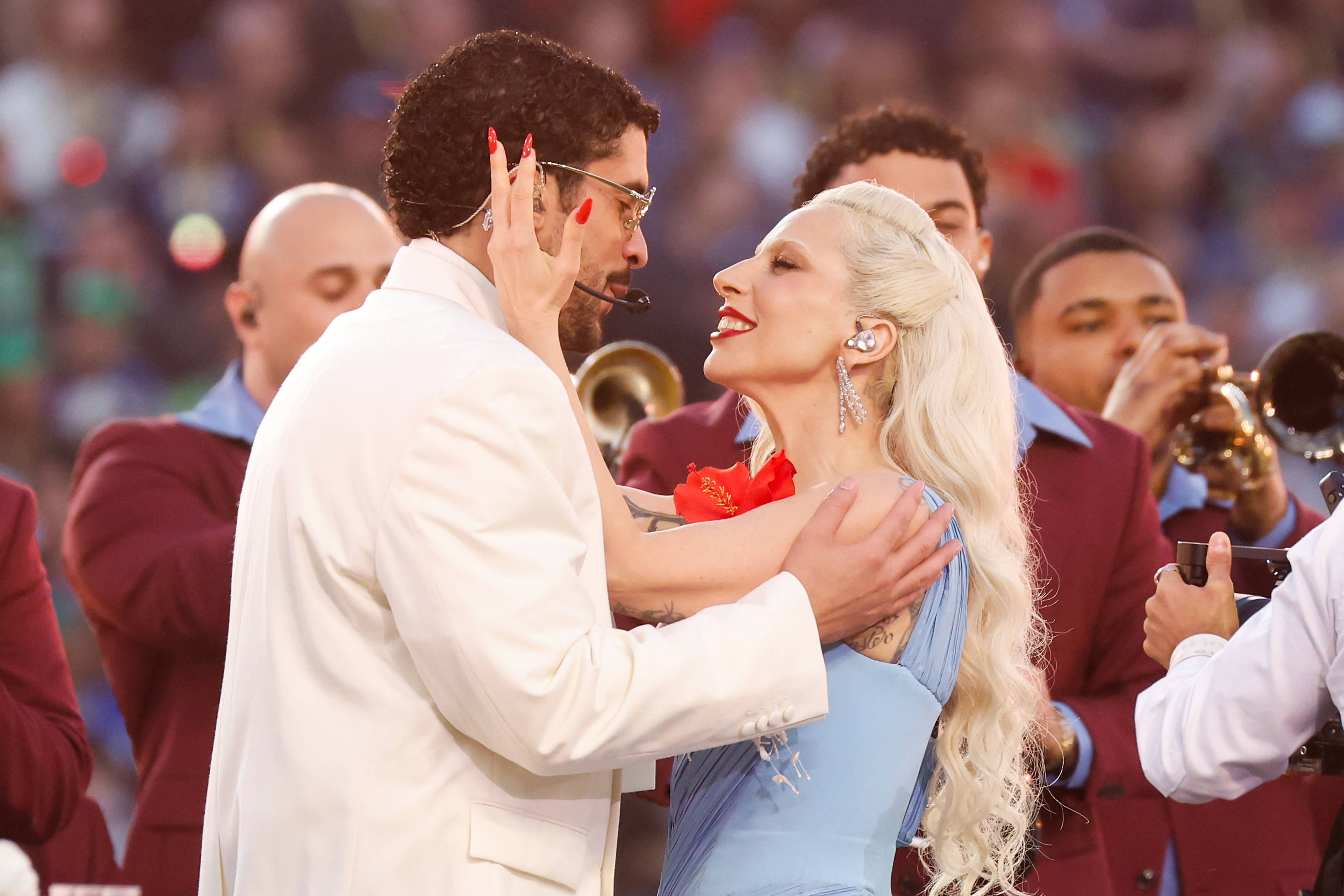 Bad Bunny, der bereits drei Grammy-Auszeichnungen erhielt und 2025 als meistgestreamter Künstler auf Spotify galt, rückte nicht ausschließlich sich selbst in den Mittelpunkt. Stattdessen teilte er die Bühne mit weiteren Künstlern und inszenierte gemeinschaftliche Momente. Einer davon war eine Eheschließung während der Show. Ein Paar, das zuvor Teil der Choreografie gewesen war, wurde von einem Geistlichen getraut. Nach Angaben aus dem Umfeld des Künstlers handelte es sich um eine reale Hochzeit. Musikalisch begleitet wurde dieser Moment von Lady Gaga, die den Song „Die with a Smile“ sang. Der englischsprachige Beitrag wurde von vielen als verbindendes Element in einer ansonsten spanisch dominierten Show verstanden.